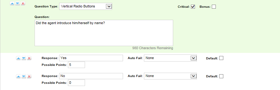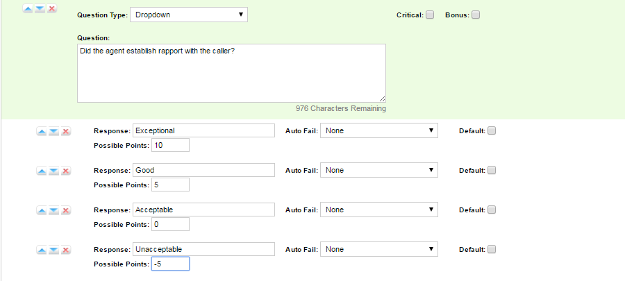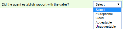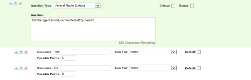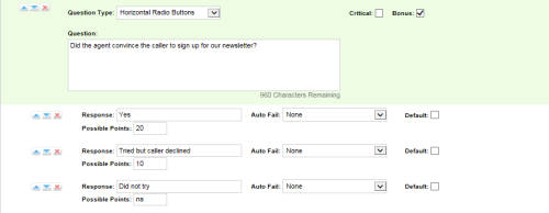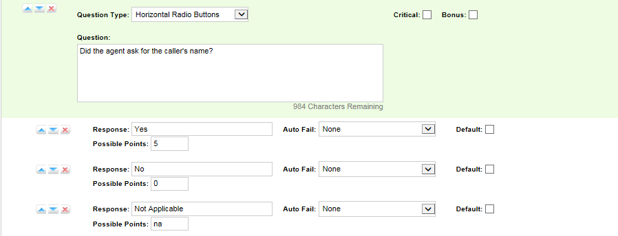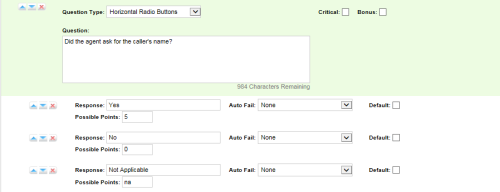 If a question may not be applicable to all calls, you can include a "Not Applicable" response option. If the evaluator selects this option, and types NA or na in the Possible Points field, the question's available points will not be counted toward the section or form totals.