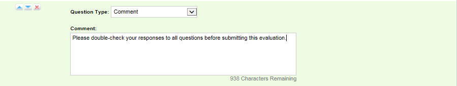Comments allow you to add a note to the form to describe the question or provide extra instructions or details for the evaluator’s benefit. Although they are listed as a question type, Comments are not really questions, so there are no responses or points associated with them. They cannot be designated as bonus or critical. Each Comment can be a maximum of 220 characters, including spaces.