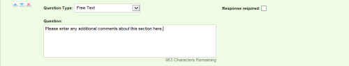 The form displays a free text field that the evaluator can use to give a descriptive analysis or to type comments. You cannot associate points with a Free Text response, so these questions are considered non-scoring. You cannot designate a Free Text question as bonus or critical. You have the option to require a response with Free Text. If this checkbox is selected, at least one character (and up to 1024 characters, including spaces) must be placed in the field.