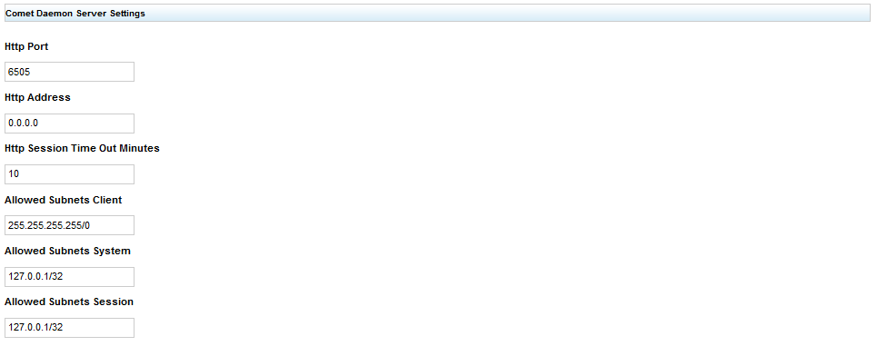 | HTTP Session Timeout Minutes | Specifies in minutes the amount of time before a session times out if CometDaemon receives no messages from the Service Manager. The default value is 10. |