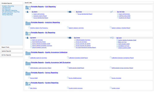 Printable reports are organized in the NICE Uptivity Web Portal at Reporting > Printable Reports. This page is divided into sections based on the various report categories. The sections in your system may vary from those shown in the preceding image, depending on the modules your organization has purchased. For example, you will not see the Analytics Reporting or Survey Reporting sections unless your organization has NICE Uptivity Speech Analytics or NICE Uptivity Survey, respectively.