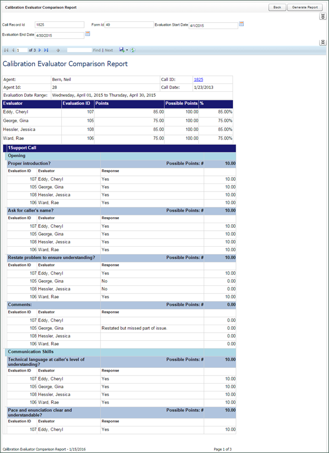 The Calibration Evaluator Comparison Report allows you to see, on a section-by-section and question-by-question basis, how each participating evaluator scored the designated call. Depending on the number of questions on the form, and the number of evaluators, this report may run to several pages in length for a single calibration.