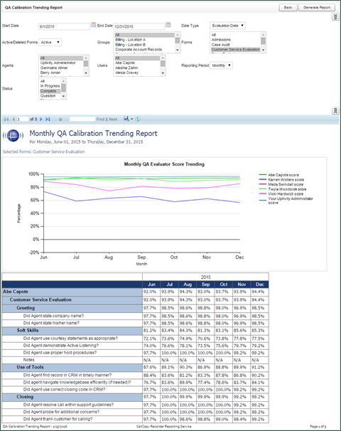 The QA Calibration Trending Report details performance of one or more evaluators on one or more QA evaluation forms over a period of time. The report is organized by evaluator and then by form. Performance can be further broken down on a section-by-section, and question-by-question basis, depending on how the QA form was created.