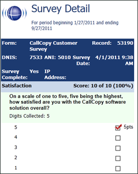 The Survey Detail report shows complete responses for one or more survey respondent(s) and also provides information about the respondent, such as DNIS