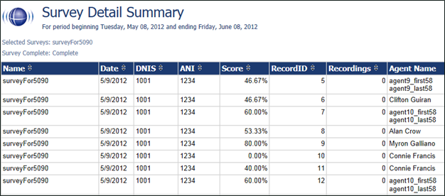 Survey Summary by Agent allows you to select a set of agents over a specific date range, and displays the number of surveys completed for each agent, given survey score, total possible points, percentage overall score, and totals for each column.