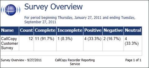 The Survey Overview report calculates the shown categories for each survey form in a time period. Positive, negative, and neutral ranges are defined on the Uptivity Survey form. If a survey form does not have any responses, it does not appear on the report.