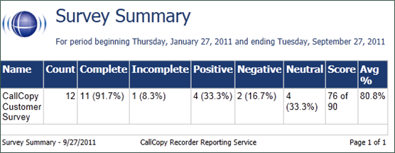 The Survey Summary report calculates the shown categories for all surveys in a time period, and displays them on a per-survey basis. If a survey form does not have any responses, it does not appear on the report.