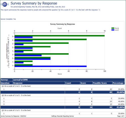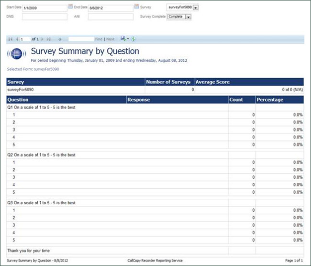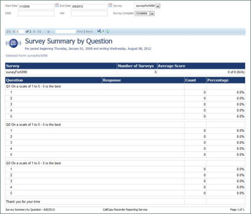 The Survey Summary by Question report provides a count of each given response to each of the questions in a survey form. You can select a date range, the survey form to evaluate, DNIS/ANI numbers, and survey completion status. For each form evaluated, the generated report displays the number of surveys completed and average score, followed by counts and score percentages for each question in the form. The Survey field is required.