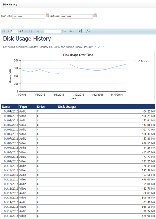 The Disk History Report displays historical disk usage in MB for recording data over a range of days. Results are displayed in both line chart and list format. If the system uses multiple drives, they are distinguished by differently-colored lines.