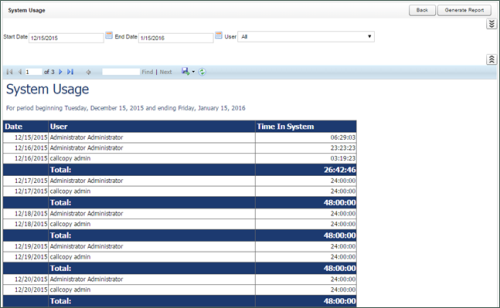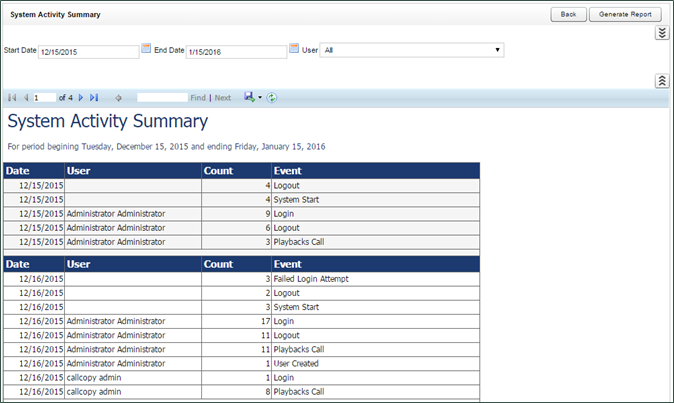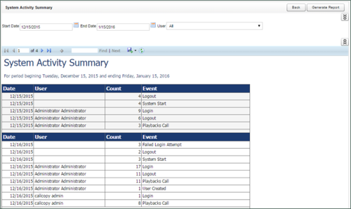 The System Activity Summary displays the actions performed in NICE Uptivity by one or more specified users during a given date range. The report is separated into different sections for each date in the range that has activity. Actions such as login/logout, call playback, call deletions, and QA functions are all tracked with this report.
